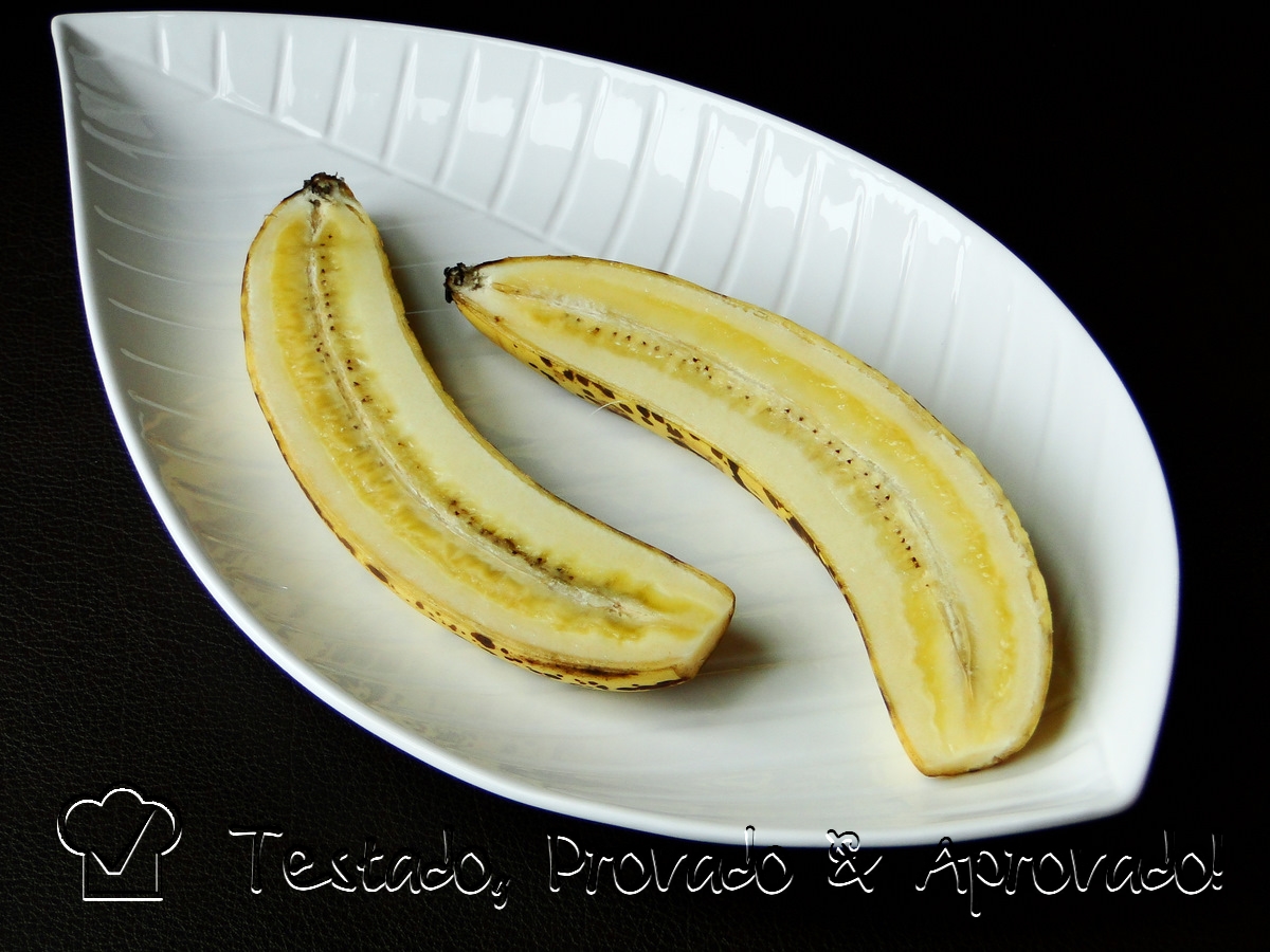 Cut bananas lengthwise and arrange them on a heat resistant plate. Bananas should be ripe but still firm.