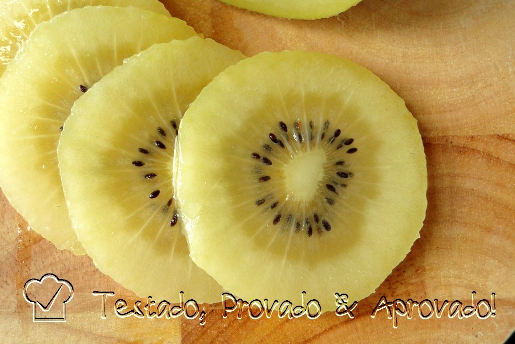 Decorate with thin slices of fresh golden kiwi.