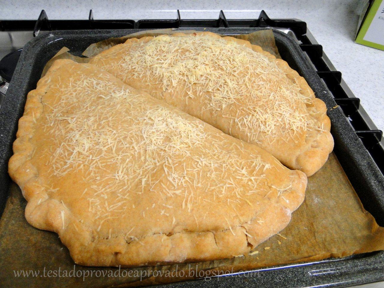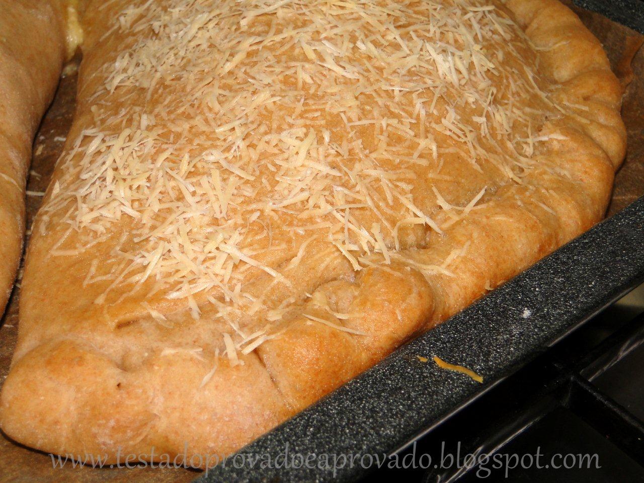 Divida a massa em duas partes e abra cada uma em um disco de aproximadamente 30 cm de diâmetro. Coloque o recheio na metade da massa. Pincele água nas bordas. Feche como se fosse um pastel, pincele as bordas novamente com água e depois revire a pontinha para selar. Com cuidado, transfira a massa para o tabuleiro untado ou forrado com papel manteiga. Repita a operação com a outra metade da massa. Consegui arrumar os dois calzones num tabuleiro quadrado (foto), um ótimo aproveitamento de espaço! Pincele os calzones com um pouco de azeite e polvilhe queijo parmesão ralado. Deixe descansar mais uns 20 ou 30 minutos. Aproveite os últimos 10 minutos deste descanso para pré-aquecer o forno. Asse a 200º C até ficar coradinho (+/- 25 minutos).