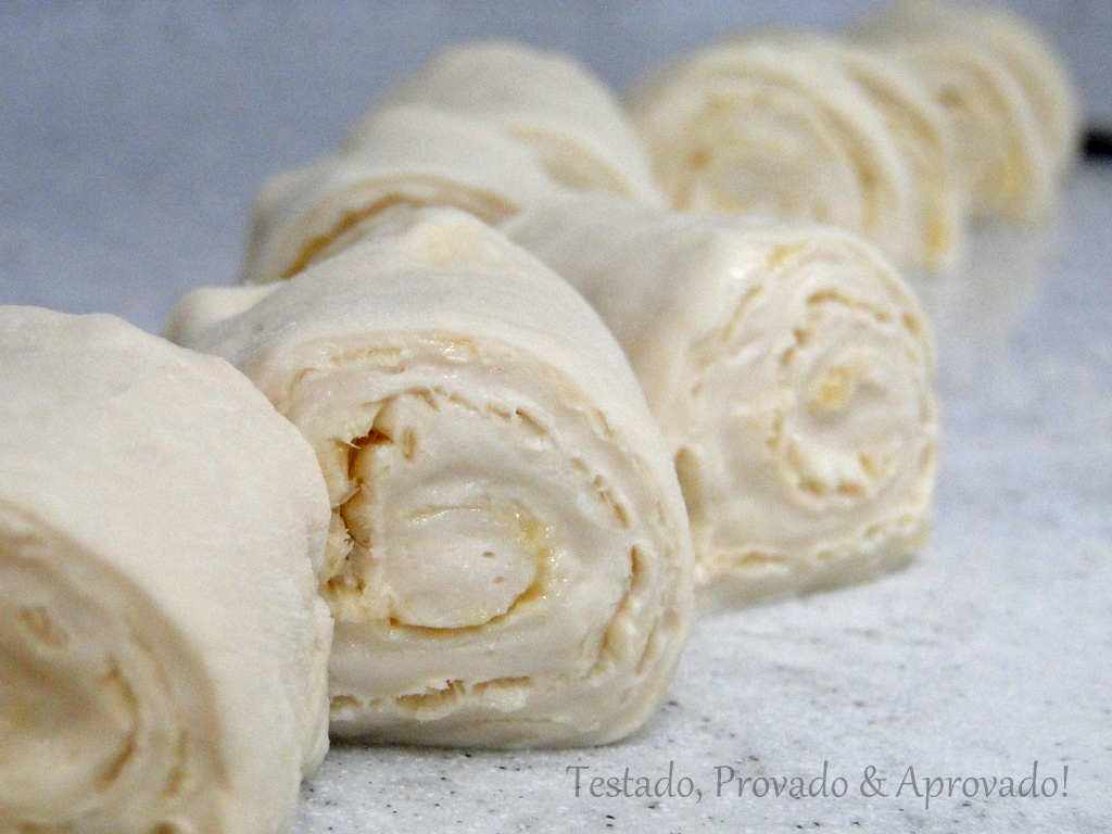 Enrolei como rocambole e afinei um pouco o rolo formado. Dividi o rolo em 12 fatias grossas e coloquei em forma de muffins untada.