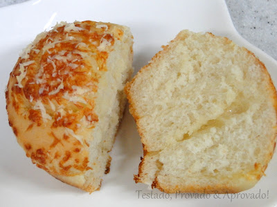 Hoje fiz um pãozinho simples, branco, usando a mesma massa do meu Pão de Alho com Azeitonas, mas ao invés de rechear com alho e azeitonas, abri a massa, passei uma fina camada de manteiga amolecida e polvillhei Parmegiano Reggiano, ralado bem fininho, o suficiente para cobrir toda a superfície.