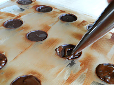 Com o auxílio de um saco de confeitar, faça pequenos círculos, usando os desenhos como guia, formando umas moedinhas finas de chocolate. Tente fazer o mais redondo possível. Leve à geladeira por uns 10 minutos.