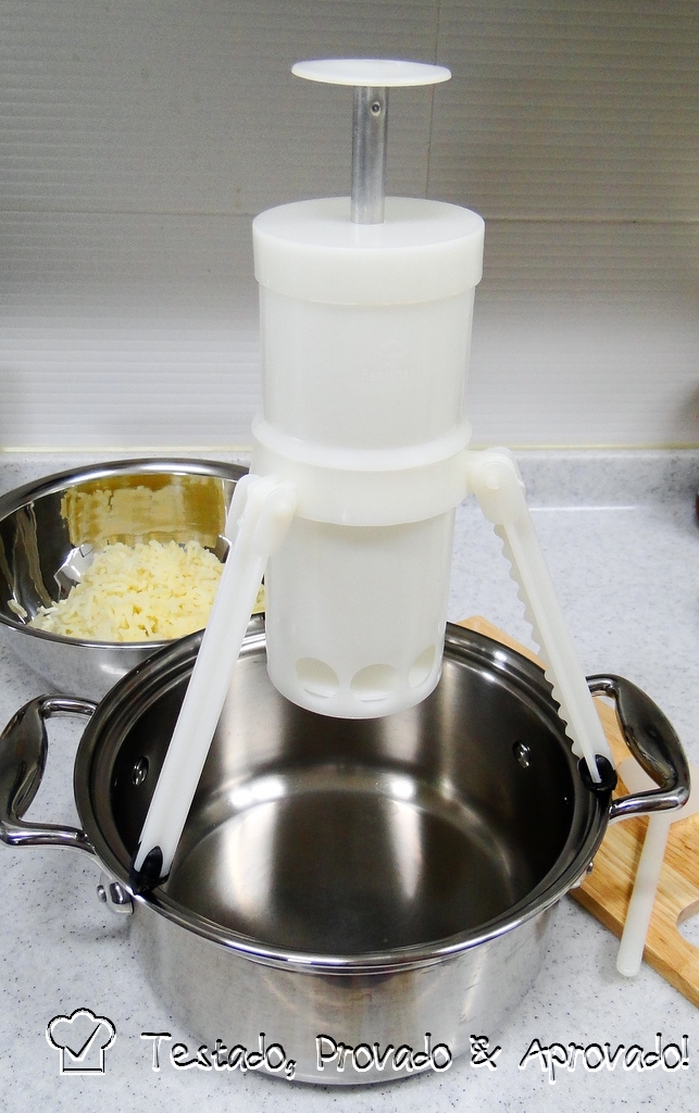 Fill the gadget with the dough and use its "legs" to hold to a pot of boiling water. Press the plunger until a little bit of dough comes out of the holes. When they get to the desired size, cut them with the help of the curved spatula that comes with the gadget.