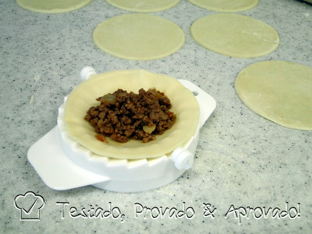 Eu usei recheio de carne moída refogada com alho e cebola, temperada com sal e pimenta do reino, e algumas colheradas de molho de tomate com chili. Esqueci das azeitonas, mas recomendo! Refoguei até secar e pronto.