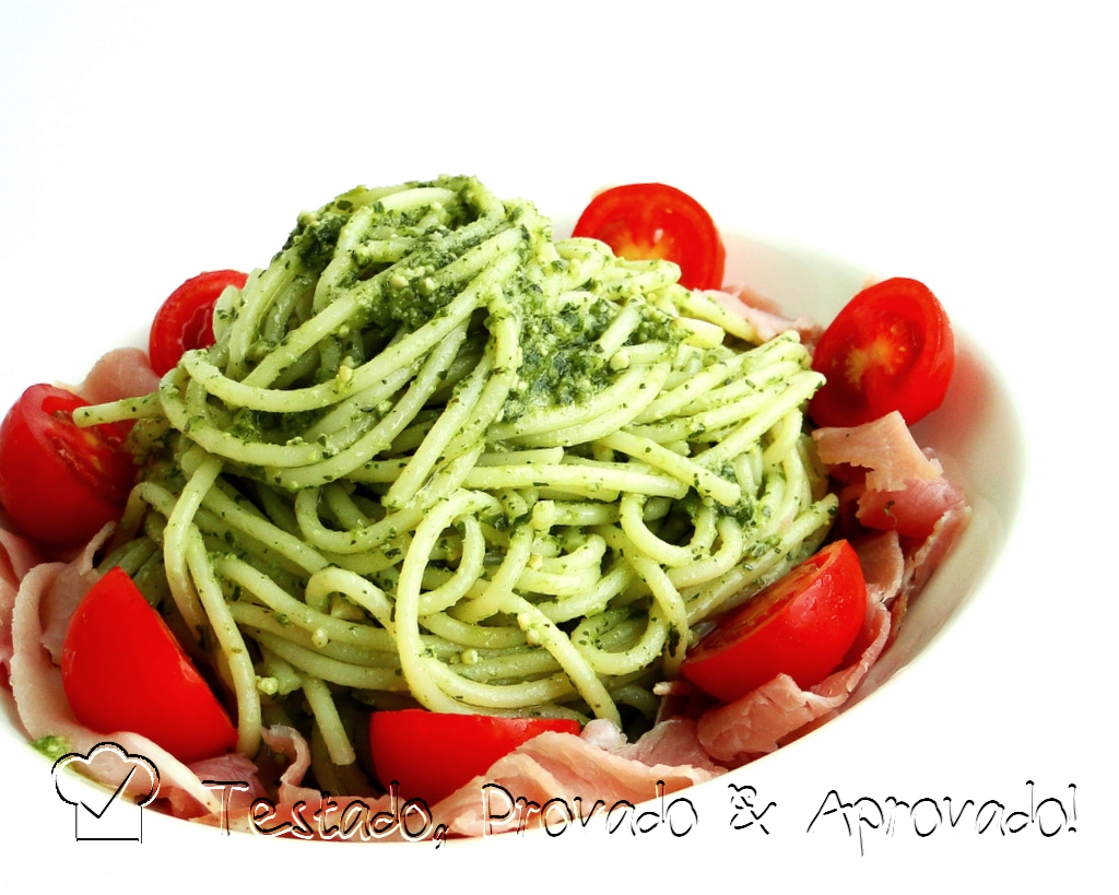 A simplicidade deste prato chega a ser incoerente com sua deliciosidade! Não trago receita hoje, pois ainda se trata de um Pesto italiano, comprado pronto, já mencionado AQUI. Bastou cozinhar uma massa, e adicionar o Pesto na hora de servir. Para italianizar ainda mais o prato, fiz uma fina camada de presunto de Parma na borda do prato e enfeitei com tomatinhos cereja. Ficou divino! Mais uma vez deixo aqui a promessa de que quando estiver no Brasil, com a nossa fartura de manjericão fresco, vou fazer a versão caseira deste Pesto e trago para vocês :o)