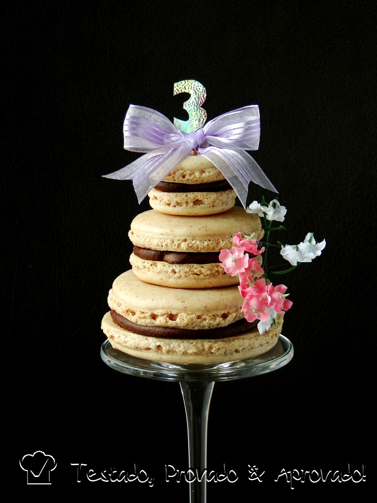 Neste mês de dezembro de 2012, o TP&A completa três anos de vida! Mais um ano de aprendizados, muita troca de idéias geniais, e mais um tanto de novas amizades maravilhosas! Para comemorar esta data, fiz um bolinho miniatura com três andares de Macarons, um para cada ano testando, provando e aprovando delícias! Escolhi os Macarons, pois eles foram a minha grande conquista culinária esse ano, e que agora ofereço a cada um dos meus leitores :o)