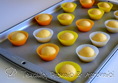 Como eu só tinha 6 forminhas desse tipo, fiz o restante da massa em mini forminhas de cupcakes.