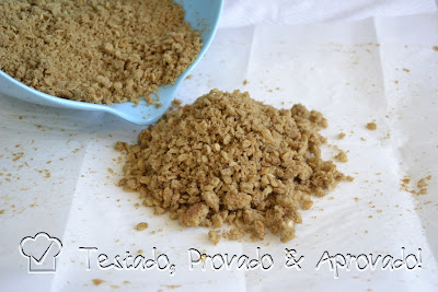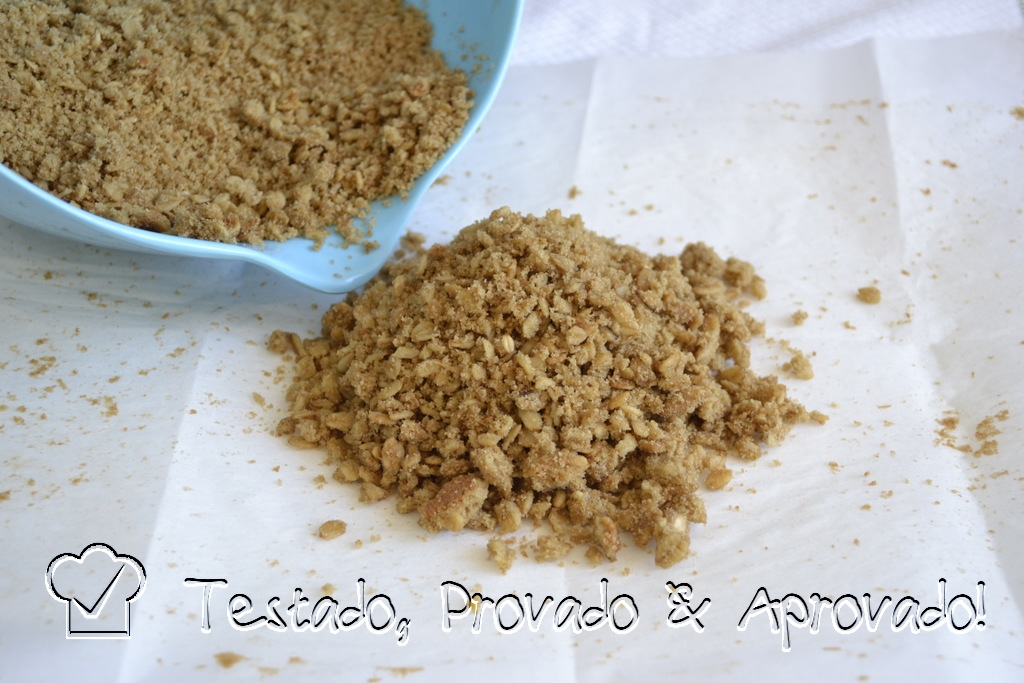 À essa "farofa" junte o restante do açúcar mascavo e da manteiga e misture com as pontas dos dedos até obter uma mistura úmida.