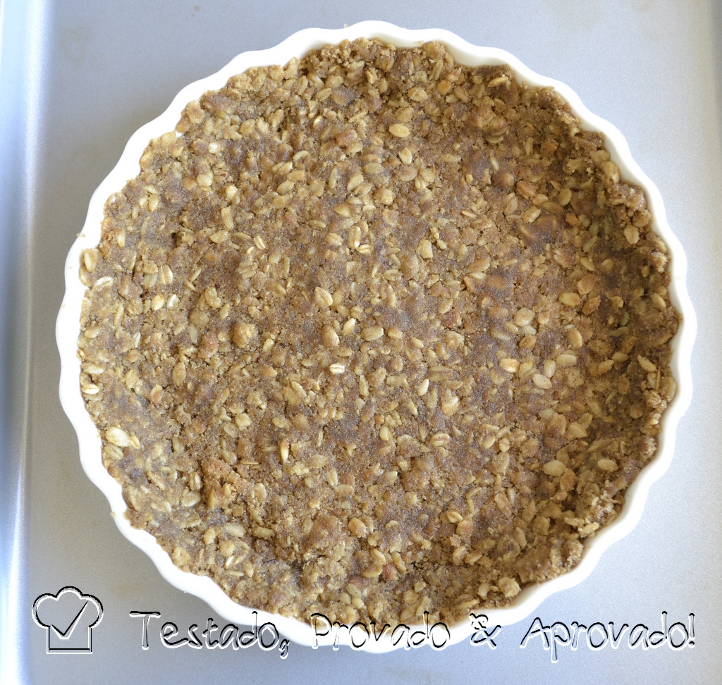 Transfira a mistura para a fôrma e pressione no fundo e laterais, formando a crosta da torta. Reserve.