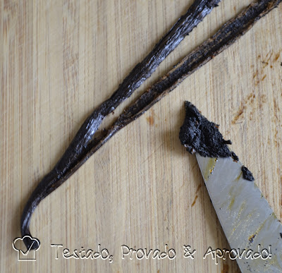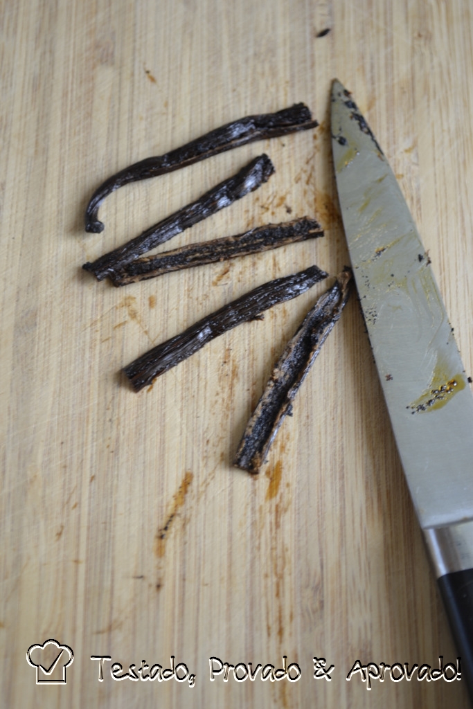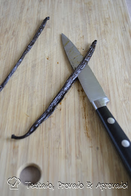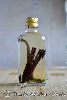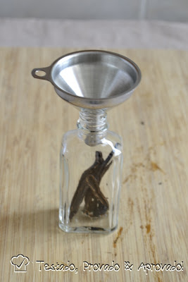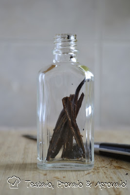 É engraçado como são as coisas. A baunilha em fava é algo tão especial e raro por aqui, que eu guardava duas favas para duas receitas muito especiais. Tão especiais, que elas nunca aconteciam! Fiquei com medo de que as favas se ressecassem e eu as perdesse de tanto esperar a ocasião perfeita para usá-las. Resolvi, então, acabar com o problema e transformar minhas favas em extrato de baunilha natural e caseiro, que eu poderei usar em várias receitas, com o mesmo sabor super especial.