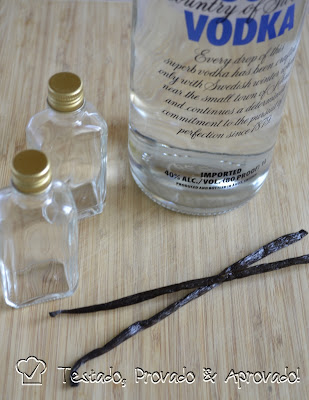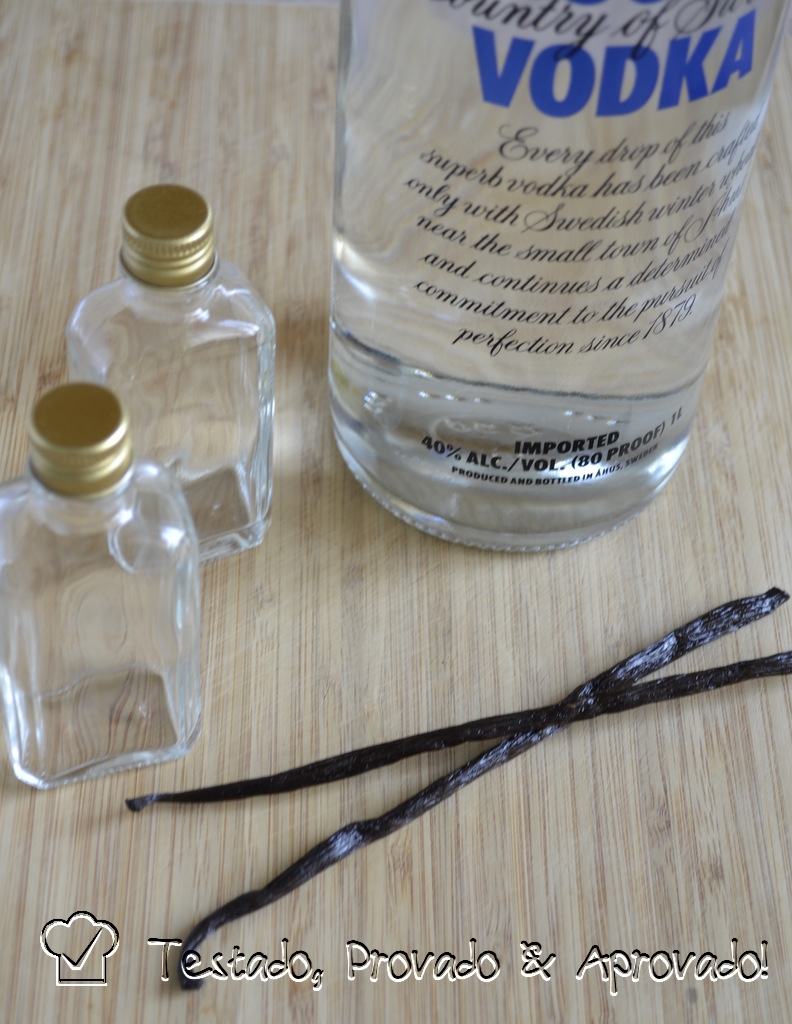 Tudo que você precisa é a fava de baunilha, uma bebida alcoólica forte, como a Vodka, por exemplo, e uns vidrinhos, que podem ser pequenos ou grandes, dependendo da quantidade de favas que você tiver disponível. Eu comprei vidrinhos com tampa hermética, de 50ml, um para cada fava. Aliás, esta proporção de uma fava para cada 50ml de álcool me parece bem adequada.