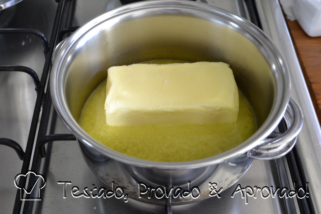 Pegue um tablete de manteiga sem sal e coloque numa panela de fundo grosso. Leve ao fogo baixo.