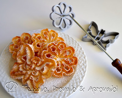 Eu fazia estes "Rosettes" com a minha mãe. Ela chamava de "sonho". Fazíamos sem o açúcar e sem a baunilha. O açúcar colocávamos só nos "sonhos" já prontos, mas mesmo assim ficavam uma delícia.Ficaram comigo quatro formas: uma borboleta, dois tipos de rosas e uma estrela. Não sei onde ela adquiriu as formas, elas estão na família há muitos anos.