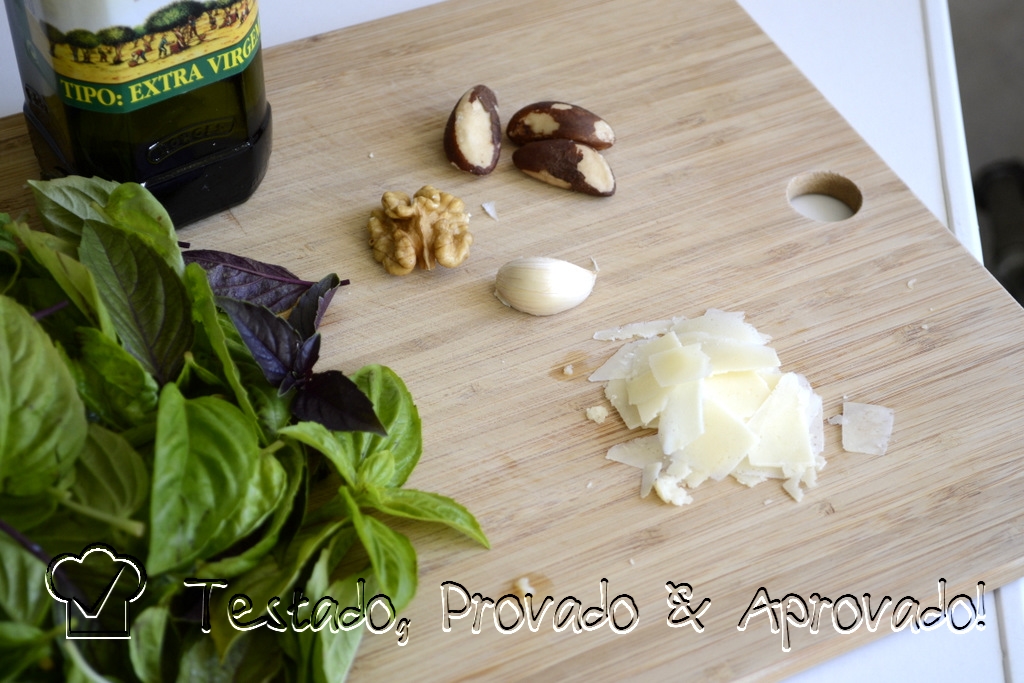 Para ficar ainda mais diferente, resolvi inovar no molho também, que ao invés de tradicional "al sugo" que gosto tanto, fiz um pesto... de manjericão roxo.... da minha hortinha! O pesto foi "abrasileirado" com castanhas do Brasil, que não deixaram nada a desejar aos pignolis da receita original italiana. Inclusive, não ficou devendo nadinha ao pesto de que tanto falei nas receitas de Espaguete ao Pesto e Salada Caprese, apresentadas aqui no blog anteriormente.