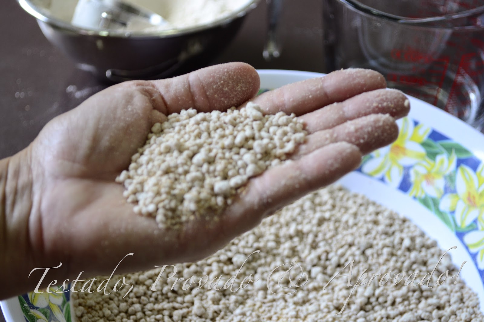 Polvilhe 1/4 de xícara da mistura de farinhas sobre o trigo umedecido. Faça movimentos circulares com os dedos, para que a farinha grude no trigo.